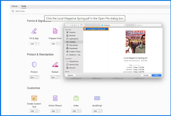 Step 1: Open the software Adobe Acrobat DC, select the Tools tab at the top left, and scroll down to find Optimize PDF tool. Click on the Open button to choose a PDF file.