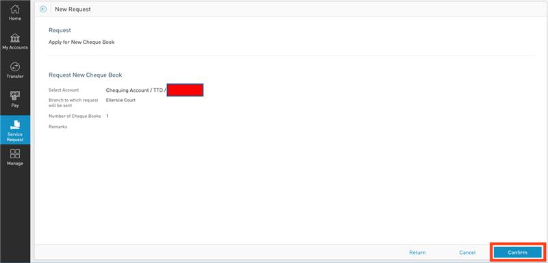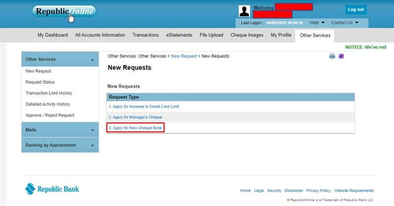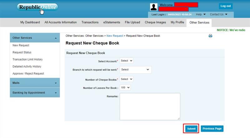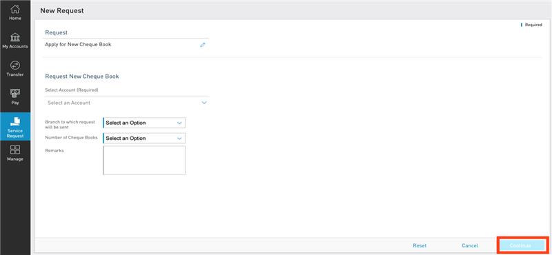 Click on “3. Apply for New Cheque Book”