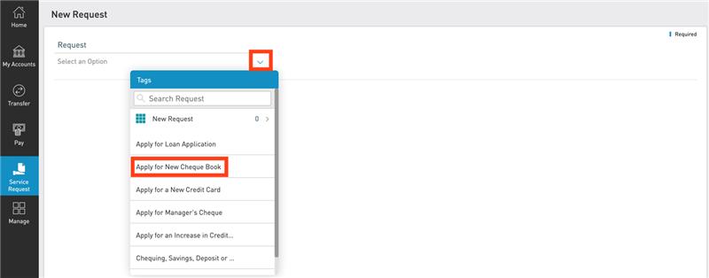Click the drop-down arrow and select “Apply for New Cheque Book”